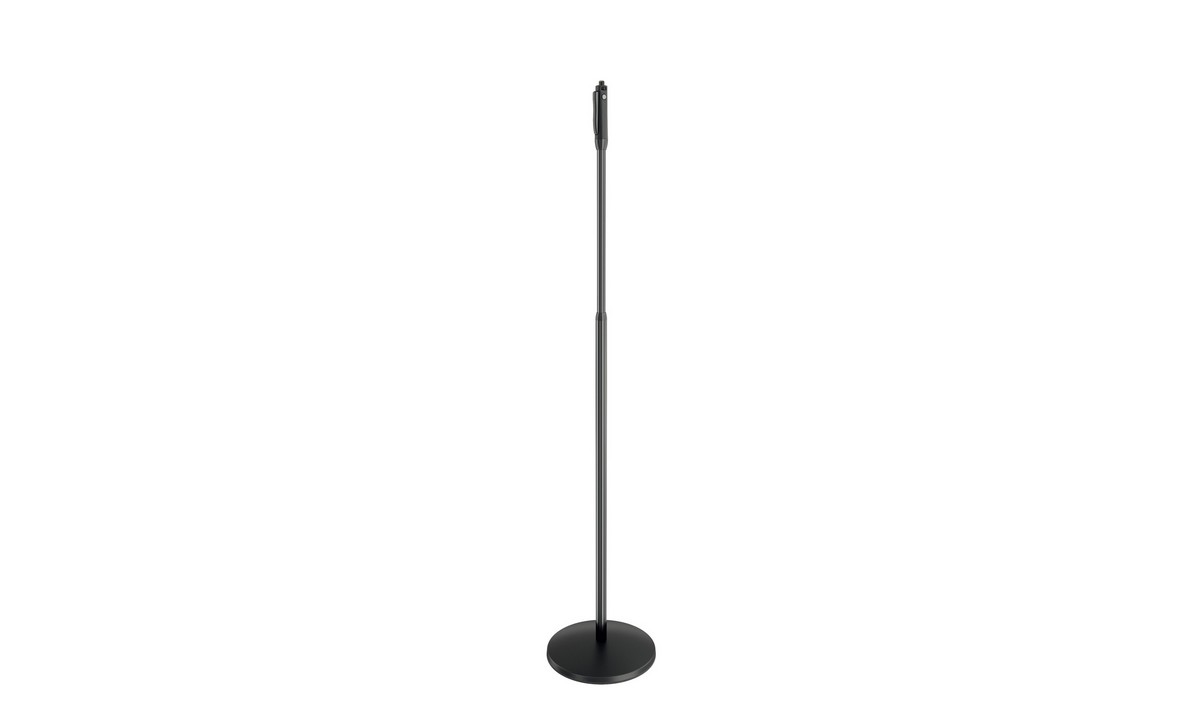 The avant garde, one hand microphone stand is setting new standards in design and function. The elegant combination of triangular shaped sections and the new design of the slender one hand adjustment mechanism go harmoniously with standard microphone clips and microphones. The integrated knurled screw is impossible to lose and makes tightening and positioning the microphone clip easy. The stand's simple elegance loses nothing by the addition of König and Meyer's classic swivel arm. The height of the stand can be adjusted quietly, simply and easily using the unique one hand clutch. The stand is significantly lightweight, but nonetheless stable due to the ingenious round base with an integrated steel plate with an attractive plastic cover. The base's circumferential rubber profile reduces undesirable vibration and footfall noise even when the stand is tilted far over to the side. Damage to flooring (e.g. parquet) is also prevented.