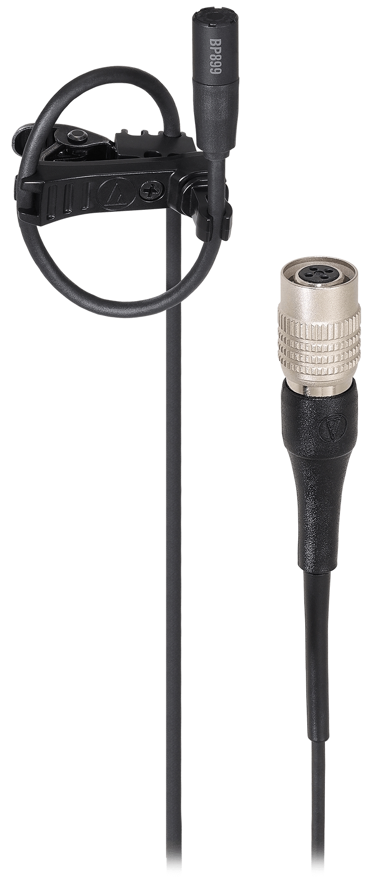 BP899cW – 55" (1.4 m) permanently attached cable terminated with a locking 4-pin connector for use with Audio-Technica cW-style body-pack wireless transmitters; no power module; Black