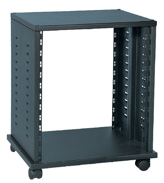 Professional steel construction standard 19” - 12U - rack stand.Featuring 4 swivel casters and 4 adjustable fixed feet. Equipped with “omega” inner reinforced bars that allow the accommodation of additional flaps to hold the equipments. 375 mm rackable depth. Ideal for stage, recording studios or home applications. Embossed black finish.
