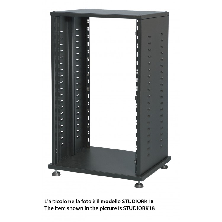 Professional steel construction standard 19” - 24U - rack stand.Featuring 4 swivel casters and 4 adjustable fixed feet. Equipped with “omega” inner reinforced bars that allow the accommodation of additional flaps to hold the equipments. 375 mm rackable depth. Ideal for stage, recording studios or home applications. Embossed black finish.
